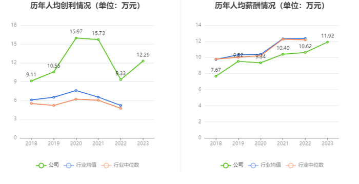 截至2023年末,公司员工总数为187人,人均创收83.95万元,人均创利12.29万元,人均薪酬11.92万元,较上年同期分别增长6.66%、31.78%、12.21%。