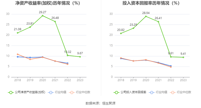 数据显示,2023年公司加权平均净资产收益率为9.67%,较上年同期下降0.65个百分点;公司2023年投入资本回报率为9.41%,较上年同期下降0.20个百分点。