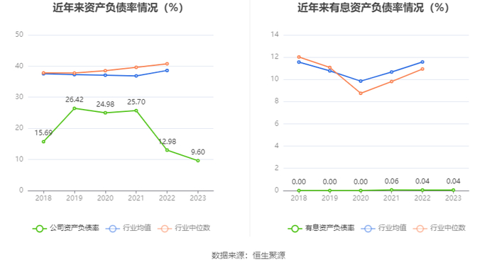 在偿债能力方面,公司2023年年末资产负债率为9.60%,相比上年末下降3.38个百分点;有息资产负债率为0.04%,相比上年末基本持平。
