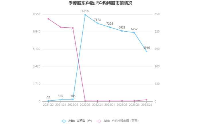 筹码集中度方面,截至2023年年末,公司股东总户数为4916户,较三季度末下降了1841户,降幅27.25%;户均持股市值由三季度末的4.73万元上升至13.21万元,增幅为179.28%。