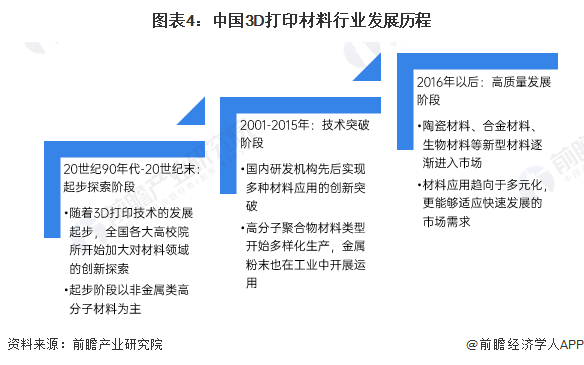 3D打印材料是3D打印技术发展的重要物质基础,材料技术是3D打印技术的核心,直接影响着3D打印的发展进程。3D打印材料的发展随着3D打印技术发展,不断实现创新突破,从最开始的高分子材料逐渐向多元化、高性能、智能化等方向发展突破。历经21世纪初期的快速发展,目前我国3D打印材料行业正迈入高质量发展阶段。