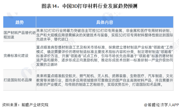随着我国国产化推进加快,标准化体系建设逐渐完善,未来我国3D打印材料行业趋势如下: