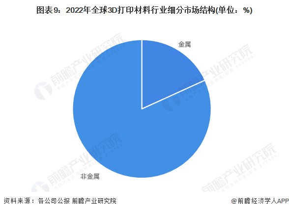 国内的3D打印材料细分市场结构大致与全球结构相仿,依据Wohler's Associates数据,2022年非金属3D打印材料占比超过80%,其中应用最广泛的为聚合物材料,占3D打印材料市场的比重高达59%。