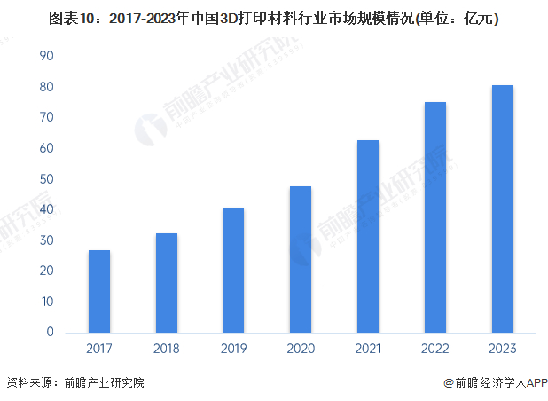 3D打印材料行业是3D打印产业的重要基础,根据CCID数据,2021年中国3D打印产业规模达到261.5亿元。初步统计2023年超过340亿元,3D打印材料占3D打印产业总规模的总比重在20%-30%之间,初步测算2023年中国3D打印材料行业市场规模超过80亿元。
