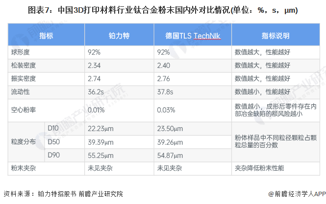依据铂力特招股说明书,其生产的钛合金粉末相关技术指标与德国TLS的钛合金粉末基本相当。反映国内3D打印材料金属材料已经达到出口标准,在国内国际均具有竞争力。