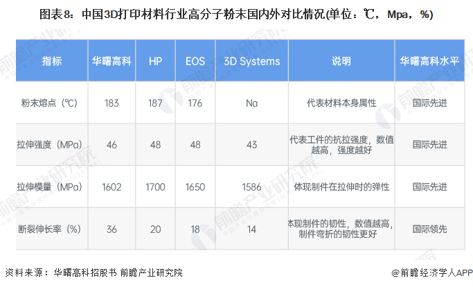 依据华曙高科招股说明书(申报稿),其生产的高分子粉末与同行业可比上市公司同类产品对比,热变形温度、拉伸强度、拉伸模量、弯曲强度和弯曲模量等关键性能指标相近,处于国际先进水平,断裂伸长率优于同类产品,达到国际领先水平。