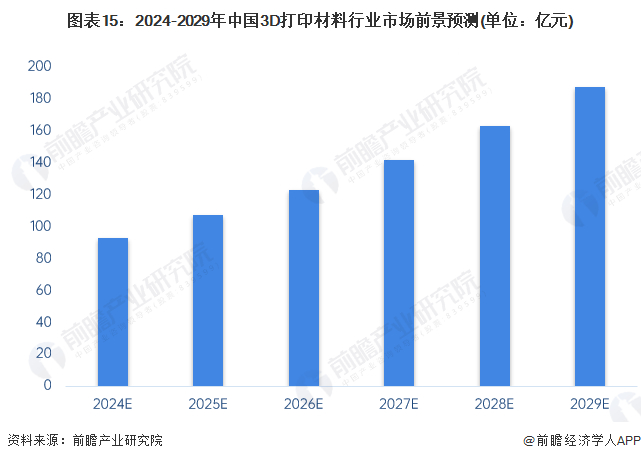 预计未来几年3D打印产业增长动力将由以3D打印设备为主向设备和材料双驱动转变,3D打印材料需求量将较快增长,2025年中国3D打印材料行业规模或将突破100亿元,2029年达到187亿元。