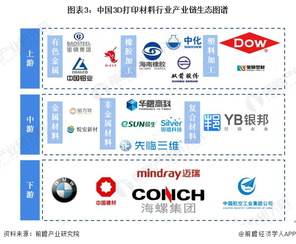 我国3D打印材料行业上游主要为基础材料开采、冶炼、加工企业,包括有色金属冶炼、橡胶加工、塑料加工等;中游为3D打印材料加工制造企业,分为金属材料、非金属材料和复合材料三大板块;下游应用包括医疗健康、航空航天、建筑材料以及汽车等领域。