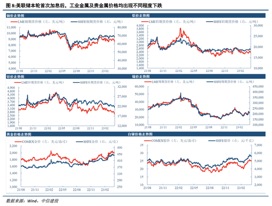 逻辑一:金融属性重估:美联储加息已至尾声,海外衰退担忧致降息预期升温,金融属性将由压制转为驱动。全球主要经济体货币政策会主导利率及流动性的变化(以美国为主)。为应对居高不下的通货膨胀,美联储自2022年3月以来已连续进行10次加息,自首次加息以来,工业金属及贵金属价格均出现不同程度下跌。鉴于货币政策对经济影响的滞后性,叠加通胀见顶回落,美联储考虑放缓加息步伐以评估经济前景,市场预期美联储加息已接近尾声。快速加息及高利率对经济伤害存在时滞,加息的负面影响正逐步显现,海外银行暴雷潮+经济回落,海外衰退或难被证伪,一旦进入经济衰退期,通胀开始回落,美联储释放流动性以刺激经济的预期强化,金属价格“金融属性”将转为驱动。