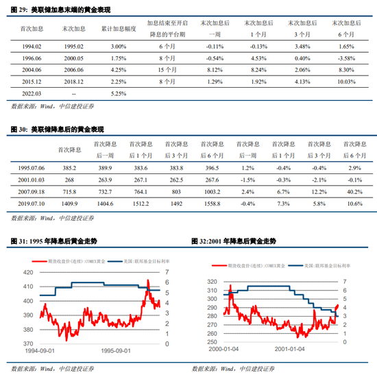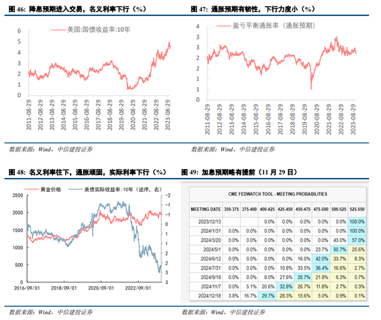 逻辑四:实际利率定价黄金的矛有效,降息开启黄金进入右侧交易。实际利率为黄金计价的矛仍旧有效,美联储2024年中降息的预期升温,降息一旦开启,实际利率会更多跟随名义利率下行。从实证角度看,美联储停止加息或即将停止加息的时间点开始直到美联储开始首次降息或第二次降息的时点,黄金价格及黄金股票的相对收益更为显著。