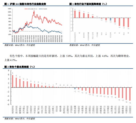 2023年初至今,沪深300指数下跌9.9%,有色金属行业指数下跌10.1%,跑输大盘0.2个百分点。但是,有色板块中,铜板块、黄金板块分别上涨14.4%、14.3%,分别跑赢大盘24.4、24.5个百分点,表现亮眼。