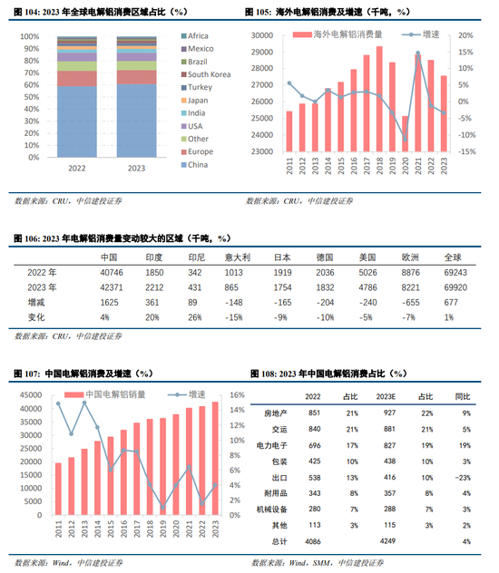 2023年10月市场在展望2024年工业金属供需格局时普遍对地产竣工给予了非常负面的预期,终端消费与地产竣工相关度高的铝板块在贝塔没有明显变动时遭遇抛售,导致2023年10月以来铝板块多数标的跑输沪深300。在2022年地产竣工下降15%及2023年新能源板块发力后,地产在2023年铝消费板块中消费下降至占比22%,考虑到2022年地产竣工有过大幅下挫及2024年地产竣工下行是逐步而非跳崖兑现,叠加“三大工程”对冲,2024年地产竣工对铝消费最大拖累在-10%以内,对应减量在100万吨以内。交运领域中的新能源汽车、电力电子领域中光伏、特变高压、以及铝材出口和包装等能提供超过150万吨的用铝需求增长。因此,2024年国内铝供需仍旧维持缺口。