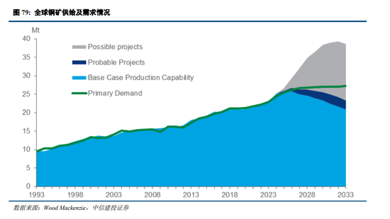 2015-2020年铜价重心围绕6000美元波动,对铜矿企业做主动性资本性开支的刺激有限,年度资本性开支在480-630亿美元水平,铜矿产能增长滞后资本性开支约5年,2018-2019年投资达峰对应铜矿增量在2023年达到峰值82.6万吨,增速3.7%。2024-2026年铜矿增量面临腰斩,分别为48万吨、24万吨、32万吨,对应增速2.1%、1.0%、1.4%。这无法满足在化石能源向电能升级潮流中扮演重要角色,消费中枢上移至2.5%之上的全球铜需求增长,铜矿资源的稀缺性日益明显。