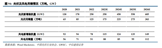 逻辑二:新旧消费动能转换,消费中枢有望上移。全球铜消费分散在建筑(27%)、电力电网(28%)、消费品(22%)、交通(12%)、机械(11%)等领域,与海外相比,我国用铜结构集中在电力电网(37%)、建筑(17%)、交通(9%)、机械(12%),有较大的优化空间。新能源相关的光伏、风电、新能源汽车等用铜新领域正在高速发展,新消费扩展有望弱化电力电网、地产在消费中的占比。到2026年光伏、风电、新能源汽车领域用铜量分别达303万吨、112万吨、220万吨,三者构成的新能源在精炼铜消费的占比从2021年的8.6%提升至2026年的22.9%。同时,将全球的精炼铜消费中枢推至2.5%之上,全球精炼铜供需格局在2024年之后持续向好,2025-2026年缺口在11.2万吨、41.0万吨。