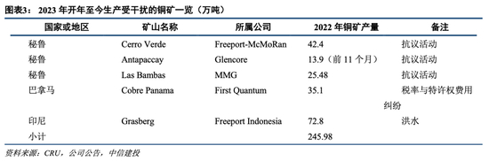 逻辑一:铜矿品位下降、干扰率提高,产量增长连续低于预期。地壳中铜元素含量约0.01%,铜矿平均品位从2000年的0.71%降至2023年0.53%,全球矿山普遍面临老龄化问题,铜矿平均品位逐级下行且趋势难以逆转。同时,智利、秘鲁等主要矿产国的天气条件、社区冲突有所恶化,铜矿开采干扰率及不确定性因素上升,2023年全球铜矿产量增加77.5万吨(+3.55%),连续2年低于市场普遍预期,资源开发项目进度“不及预期”或将成为未来最“符合预期”之事。根据上市公司产量指引及资讯机构跟踪的矿山变动,预计全球铜矿增速将于2024年见顶。