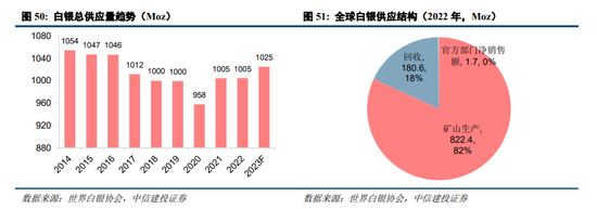 逻辑一:未来供给增量有限。全球银矿供应中,约72%的矿产银产量来自铅/锌矿、铜矿和金矿的副产品,其中铅锌矿的副产是矿产银的最大来源,铅锌矿副白银产量下降导致总产量难以增长,同时矿山品位的下降、部分地区的社会动荡等因素可能会导致矿产银的产量达不到预期。同时,白银需求旺盛, 2020年以来白银需求已累计增长38%,绿色经济带动白银的工业需求增长,光伏用银增长强劲。