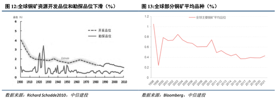 地壳中铜元素含量约0.01%,铜矿勘探平均品位0.5%左右,铜矿开采品位过去100年时间里从2%逐渐下滑到0.43%,从大自然中提取原矿富集成铜精矿的成本越来越高。同时,智利、秘鲁等主要矿产国的天气条件、社区冲突有所恶化,铜矿开采干扰率及不确定性因素上升,也使得铜矿获得成本增加。