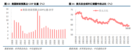 逻辑三:美元信用衰弱,黄金信用背书需求增加。美元是全球经济中主要的储备货币之一,2022年俄乌战争美国将俄罗斯剔除SWIFT结算系统强化非美经济体多样化其他货币和资产的认知。另外,美国总体债务占国内生产总值的比例走高,美国政府处理负债问题的能力造到质疑,美国信誉度的下降会伤害到非美经济体对美元的依赖度。黄金用做非美货币本币信用的担保,将提振其需求,同时推高黄金价格中枢水平,而这也在一定程度上解释了实际利率与黄金价格均上涨。