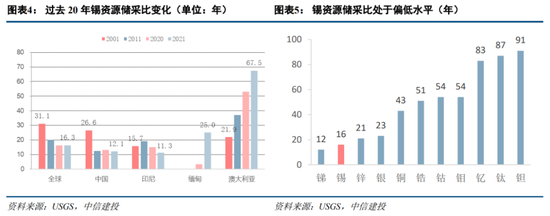 (1)资源端,锡稀缺程度较高,全球锡资源静态储采比仅约11:1(假设全球锡原矿选矿回收率70%),传统主产区资源品位下降趋势难以逆转,锡资源稀缺性日益显现。