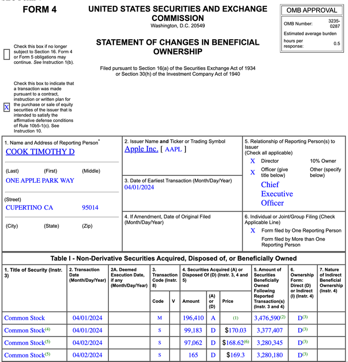 当地时间4月3日,苹果公司在美国证券交易委员会提交的文件中披露,苹果CEO蒂姆・库克于4月1日、2日合计出售196,410股公司股票,套现33,258,614.4美元。