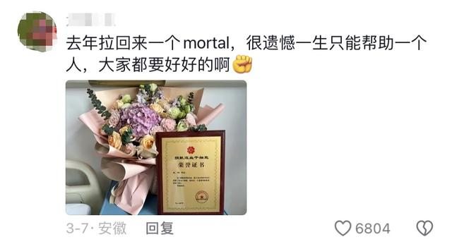 还有人晒出了自己捐献造血干细胞的荣誉证书,“去年拉回来一个Mortal,很遗憾一生只能帮助一个人,大家都要好好的啊!”这条评论获得了6000多人的点赞。“先生大义”之类的评论成为高赞。