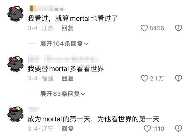 有人用相似的用户名和相同的头像,模仿了Mortal。更多人把善意带给了他(她),留言说,“要带着Mortal看世界”“替Mortal多看看世界”。
