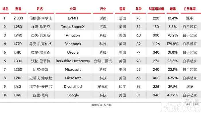 法国奢侈品大亨阿尔诺连续第二年成为世界首富,其个人财富较2023年增长10%至2330亿美元。马斯克仍排名第二,个人财富约为1950亿美元,该数字虽较去年增长8%,但由于特斯拉股票价格下跌,这一数字远低于其此前高达3000亿美元的个人财富最高值。