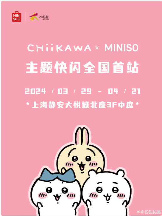 今年3月16日,名创优品在微博上官宣拿下了Chiikawa,并于3月29日在上海开启首个“名创优品XChiikawa”主题快闪店。