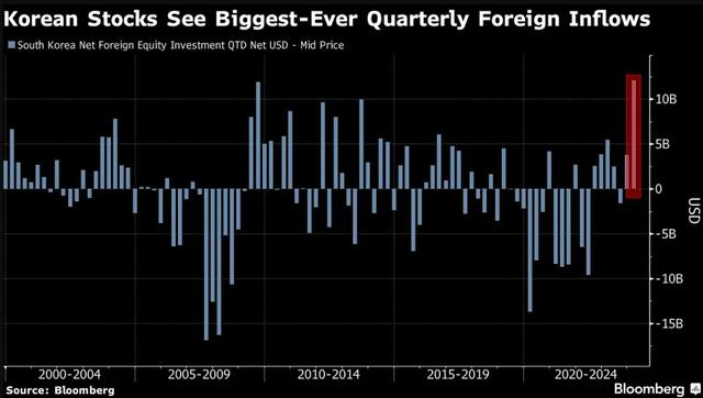 根据业内汇编的数据显示,2024年一季度,海外投资者净买入了122亿美元(约合人民币883亿元)的韩国本地股票,这一数字在亚洲市场上仅次于日本股市。
