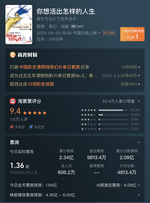 日本知名动画导演新作《你想活出怎样的人生》,目前已上映2天,总票房破2亿元,已打破中国影史清明档影片首映日票房等多项纪录。豆瓣评分为7.9分。