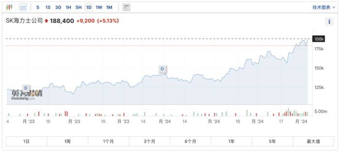 或受此消息刺激,韩国股市持续走高,韩国综合指数收涨1.29%。其中,韩国芯片巨头SK海力士股价大涨超5%,创历史新高,总市值升至123.3万亿韩元(约合人民币6600亿元)。消息面上,SK海力士宣布将斥资38.7亿美元在美国建立一座先进封装厂和人工智能产品研发中心。