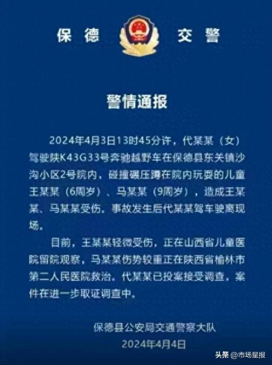 2024年4月3日13时45分许,代某某(女)驾驶陕K43G33号奔驰越野车在保德县东关镇沙沟小区2号院内,碰撞碾压蹲在院内玩耍的儿童王某某(6周岁)、马某某(9周岁),造成王某某、马某某受伤。事故发生后代某某驾车驶离现场。