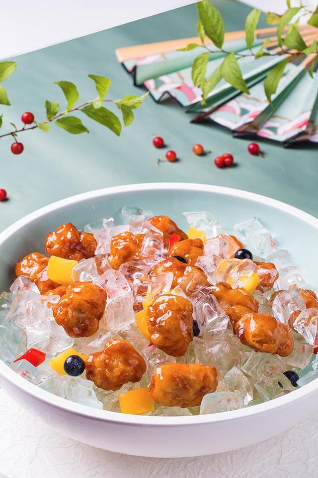 “冰镇咕噜肉”是来到陶陶居必吃的招牌。咕噜肉向来是外国友人喜爱的菜肴。这道菜与众不同,是陶陶居打破传统做法的创新之作,整盘的晶莹冰块下,咕咾肉若隐若现,清透诱人。厨师用“黄金六两”的猪颈肉,包裹特制脆浆先炸再炒。外皮冰镇酥脆,内肉嫩热,外冷内热冰火两重天,上桌必须马上吃。