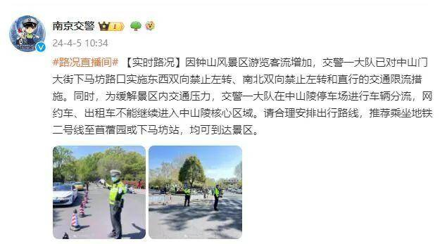 因钟山风景区游览客流增加,交警一大队已对中山门大街下马坊路口实施东西双向禁止左转、南北双向禁止左转和直行的交通限流措施。同时,为缓解景区内交通压力,交警一大队在中山陵停车场进行车辆分流,网约车、出租车不能继续进入中山陵核心区域。请合理安排出行路线,推荐乘坐地铁二号线至苜蓿园或下马坊站,均可到达景区。