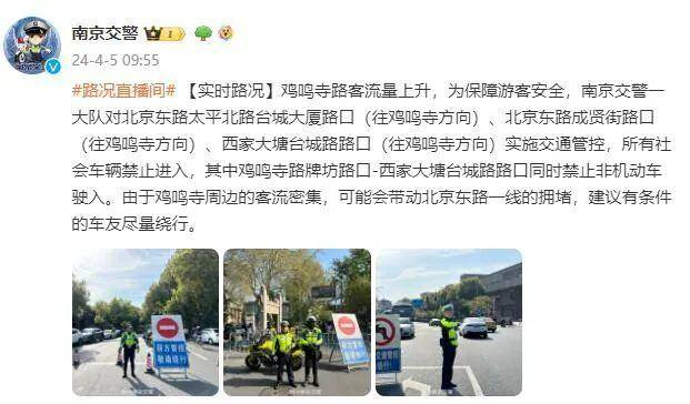 鸡鸣寺路客流量上升,为保障游客安全,南京交警一大队对北京东路太平北路台城大厦路口(往鸡鸣寺方向)、北京东路成贤街路口(往鸡鸣寺方向)、西家大塘台城路路口(往鸡鸣寺方向)实施交通管控,所有社会车辆禁止进入,其中鸡鸣寺路牌坊路口-西家大塘台城路路口同时禁止非机动车驶入。由于鸡鸣寺周边的客流密集,可能会带动北京东路一线的拥堵,建议有条件的车友尽量绕行。