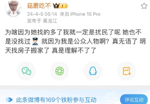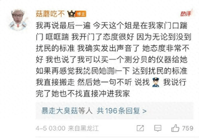 随后,陈泽微博账号@菇蘑吃不 发文回应扰民:称邻居在门口踹门,还称报警,他自己承认自己虽然发出声音了,但远没达到扰民标准,并说自己可以买一个测分贝的仪器。