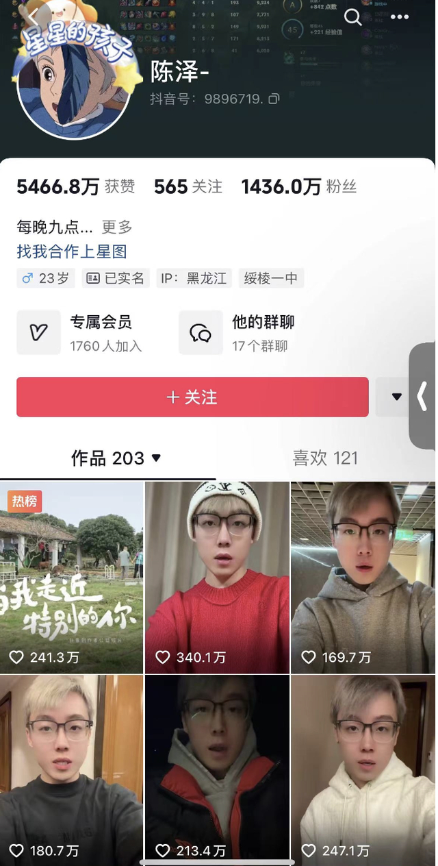 据了解,陈泽是一名颇具人气的游戏主播,在抖音上1435多万粉,微博粉丝108万。今年1月,陈泽因合同纠纷被一家文化传媒公司起诉,索赔违约金1亿元。文书显示,原告系国内知名短视频平台的合作运营方。