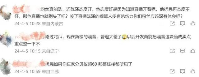 陈泽回应称,扰民是有标准的,多少分贝是扰民,并不是自己后半夜发出声音了就是扰民,而自己的声音与扰民的标准分贝还差很多,不能因为自己后半夜发出声音了或者自己是公众人物就是扰民……