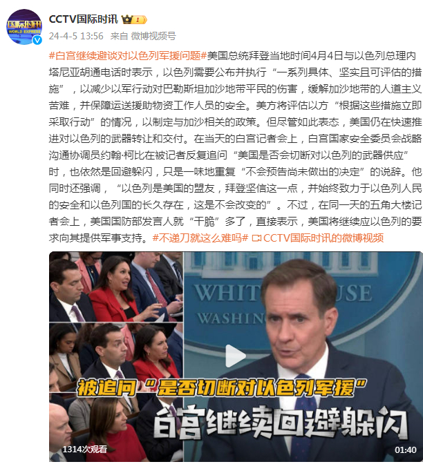 被追问"是否会切断对以色列的武器供应",白宫官员回避躲闪