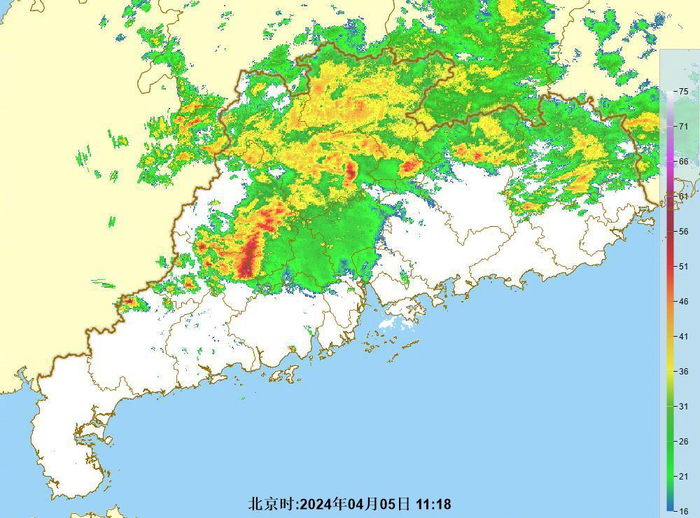 4月5日11时18分,广东雷达拼图显示仍有强降水回波形成并影响广东 图/广州天气网