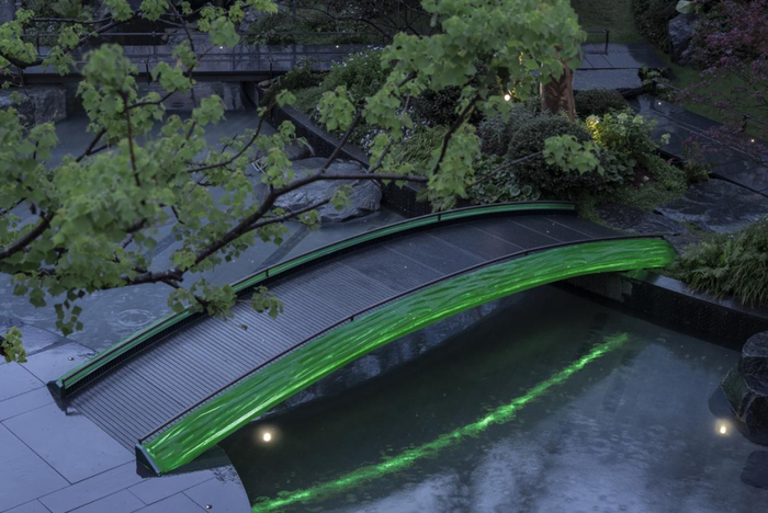 建筑穹窿形状的天花,饰以精致的彩画、浮雕,称之为“藻井”,象征着崇高与尊贵,石狮·璞玥东方大门的无雨落客区,以金属材料还原出层层内收的藻井形象,彰显出归家的仪式感。“灯笼”,是东方家园的温暖符号,象征着万家灯火、张灯结彩,苏州·朗云的时光长廊、张家港·云湖上的贵宾室里的灯笼,用金属格栅与焊接工艺对其进行转译,呈现出传统灯笼竹编交织的肌理与精致感。“谦谦君子、温润如玉”,古时“玉带桥”往往能取玉带的弯曲之形,但古人受材料限制之所不能,难成玉石的翡翠之色,苏州·朗云的“玉带桥”利用现代材料与工艺,兼得玉石“形”与“色”的风采,也得其美好寄寓。