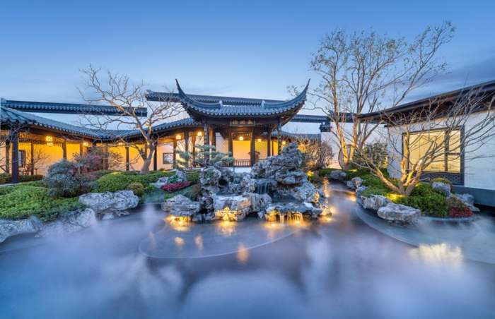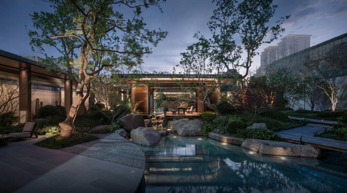 苏州·朗云汲取王维《山居秋暝》与夏圭《观瀑图》中“清泉石上流”的意境,打造水石相互激荡、闲亭雅座观景,感受“落瀑听泉,坐石临流”的诗意;张家港·云湖上汲取张若虚的《春江花月夜》中的“春江花月、浮光潮生”意境,以青色琉璃为池底、潺潺流水划过,模拟春潮滚滚的场景,每到晚上,皓月当空,对映着一池涌动的春潮,“海上生明月”的画面浮现眼前;上海·缦云以刘松年的《四景山水图·夏图》为引,于庭院中栽植一棵枝繁叶茂的大朴树,树荫之下歇息论叙,品味“古树流年、煮酒煎茶”的乐趣;石狮·璞玥东方汲取的是范成大《夜坐听雨》的意境,通过十几层的金属构件,进行叠涩出挑,还原出诗中“四檐密密又疏疏”,每当雨水打在檐口,就像一首轻柔的音乐,静享“水聚天心、听雨观天”的悠然。