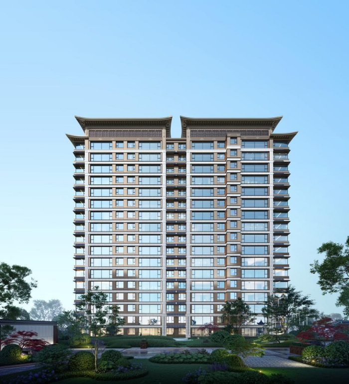 建发房产同样注重于差异化产品的属地化思考,提取大明湖、老洋行、万字会的立面精髓,结合现代建筑之典雅,采用三段式结构、双重檐形制及东方飞檐、传统木构椽子以及中式纹样装饰,呈现出大气沉稳的新中式外立面。同时,约33%的超高窗墙比以及石材及铝板材质、线条框架、三玻两腔玻璃,进一步提升建筑的质感和居住舒适度。