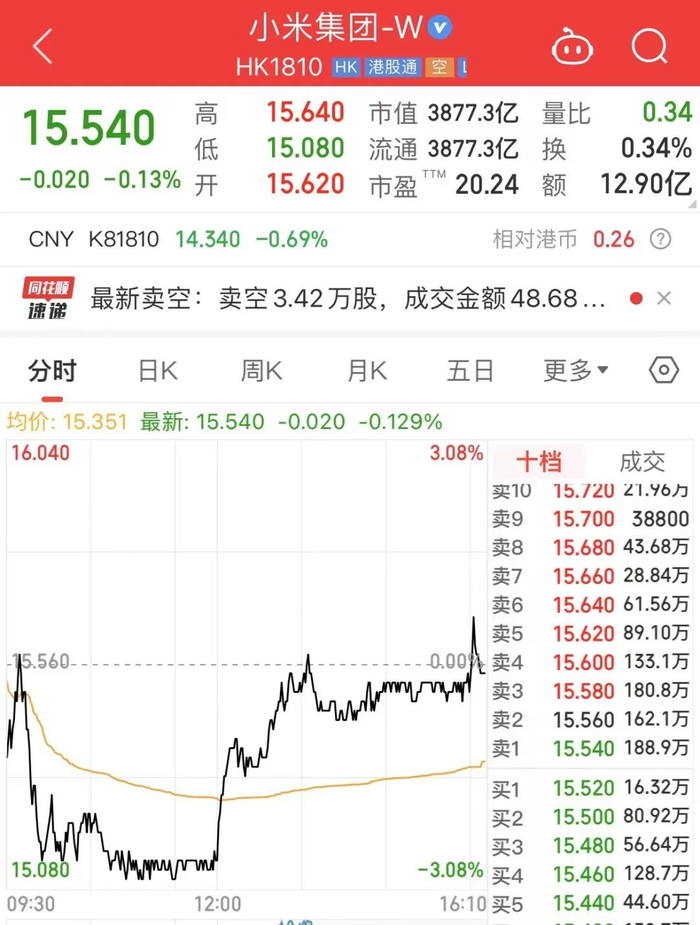 据公开资料,小米集团港股的代码是1810。截至4月5日港股收盘,小米集团(HK1810,股价15.54港元,市值3877.3亿港元)股价微跌0.13%。