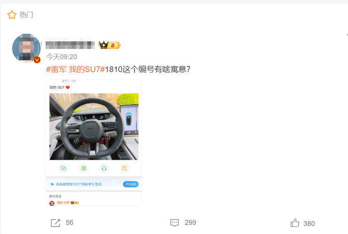 值得注意的是,车上方向盘下方的数字“1810”引起了网友的注意。