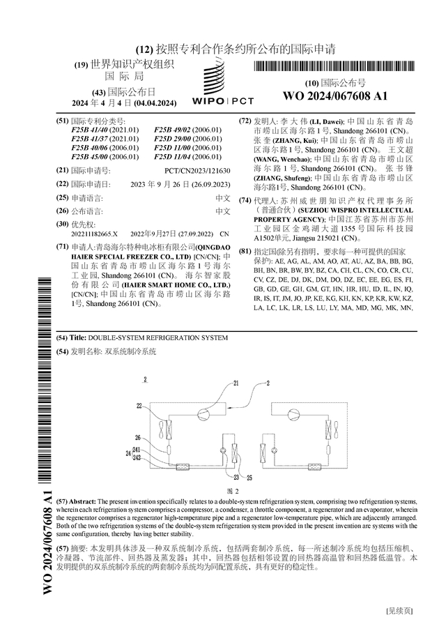 海尔智家公布国际专利申请:“双系统制冷系统”