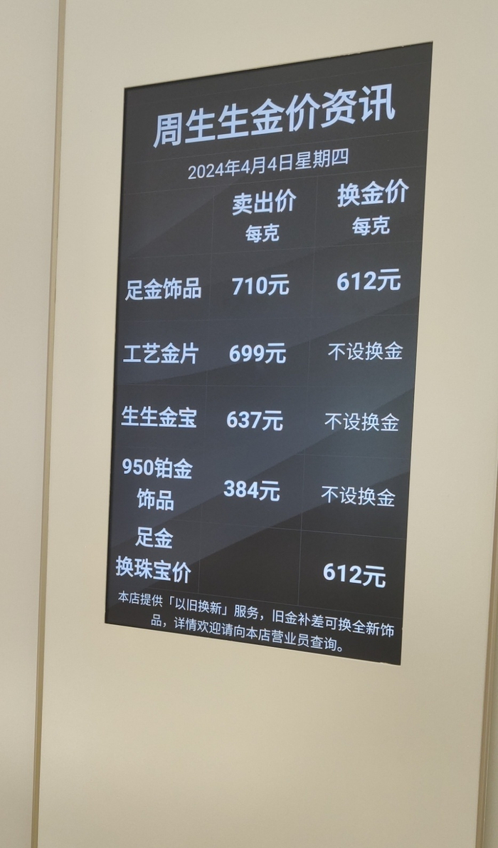 上海黄金饰品行业协会数据显示,4月3日老凤祥足金价格为700元/克,老庙足金价格也达到702元/克;4月4日周生生足金价格最新报710元/克,周大福足金价格报709元/克。