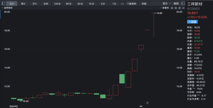 在固态电池概念板块中,三祥新材周三收盘涨停并创历史新高。公司虽在前一天盘后披露异动公告进行风险提示但依旧难抵二级市场炒作热情。周三盘后三祥新材再度公告称,固态电池领域锆基材料为公司锆系产品下游的细分应用,公司与下游客户仍处于产品送样检测及优化阶段,尚未形成规模化销售,该领域业务收入占公司主营收入比例较小,预计占比不足1%,对公司短期业绩影响有限。三祥新材在3月25日至4月3日8个交易日股价累计最大涨幅约90%,已接近翻倍。