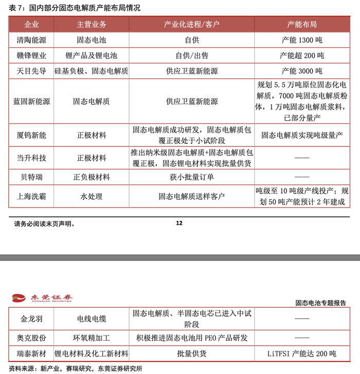 此外,根据东莞证券黄秀瑜在1月31日研报中梳理,赣锋锂业、天目先导、厦钨新能、当升科技、贝特瑞、上海洗霸、奥克股份等部分企业已经成功研发出固态电解质,有些处于中试、送样客户阶段,有些已实现小批量供货。整体来看,目前固态电解质的产业规模尚小,但具备一定的规模化基础。