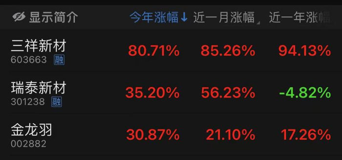 从今年以来的固态电池板块涨幅榜来看,据choice数据显示,三祥新材位列首位,瑞泰新材排名第二,均已赶超金龙羽。据计算,上述三家上市公司1月2日迄今股价累计最大涨幅分别为159%、114%和72%。